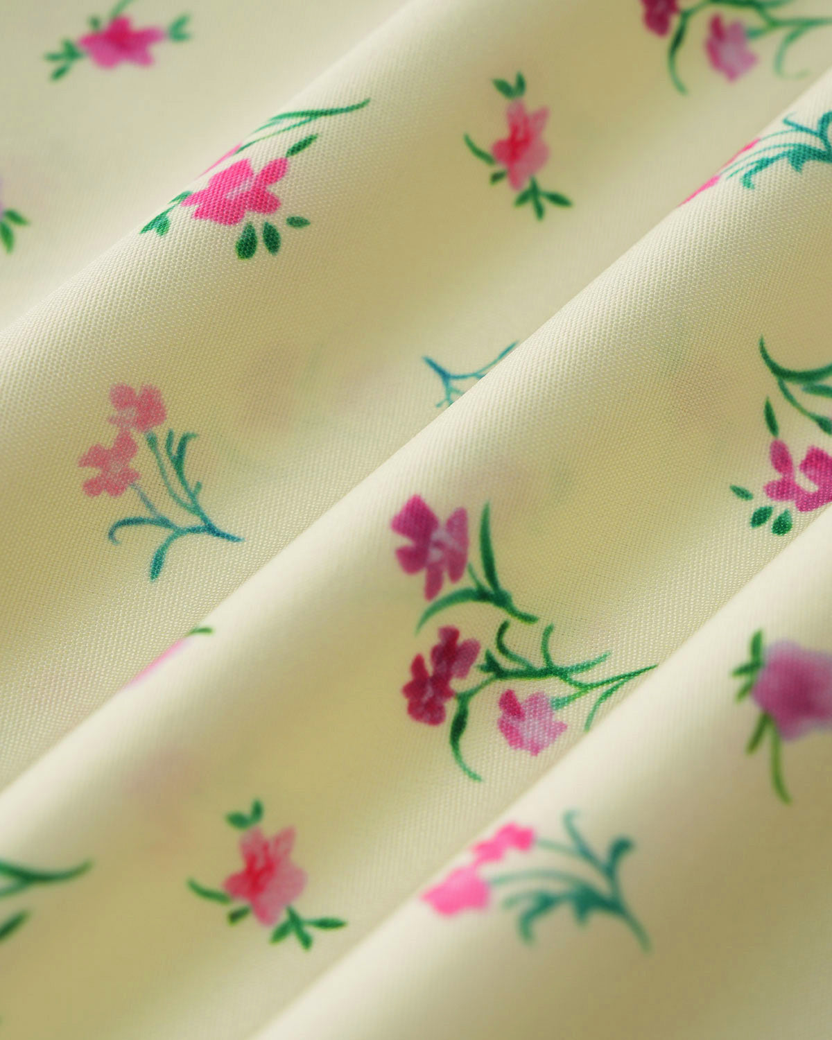 Sarı Çiçekli Kare Yaka Kabarık Kollu Midi Elbise